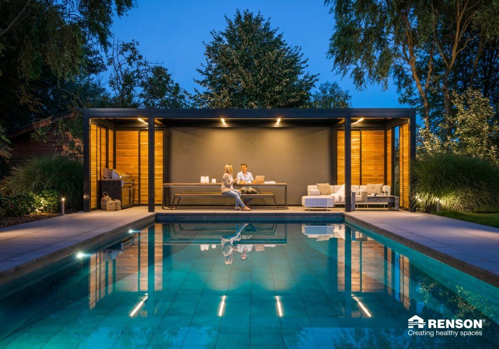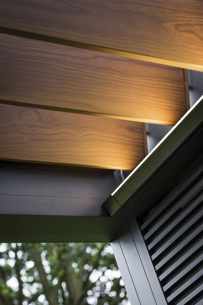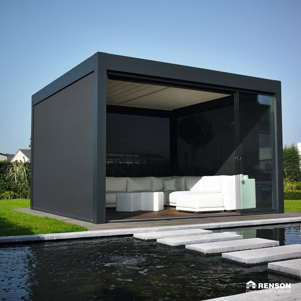 Nedbør ledes bort av integrerte renner og avløp, som forhindrer at vann skal dryppe ned på møbler og inventar når pergolaen åpnes eller er lukket.