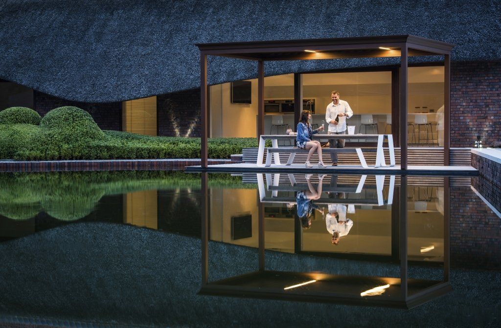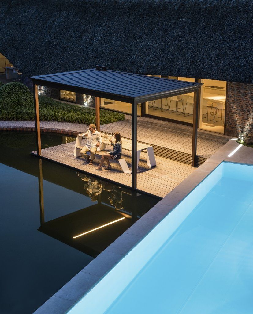 Algarve er en overbygging og pergola som du kan plassere over alt: på terassen din, ved siden av svømmebassenget, frittstående i hagen eller på brygga. Den kan også brukes som designcarport. Algarven utstyres med fast tak til feks carport eller eller med lamelltak som kan rotere. Denne kan leveres med ekstrautstyr som, ledlys, varme, lyd, screens og skyvedører med glass eller loggia.