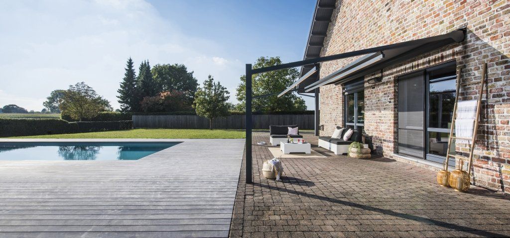 Det stilige og minimalistiske Lapure® terrassetak er en vannavstøtende solbeskyttende takskjerm som hviler på elegante og diskrete aluminiumsøyler (uten påtrengende skjøter) og er montert på en eksisterende vegg.