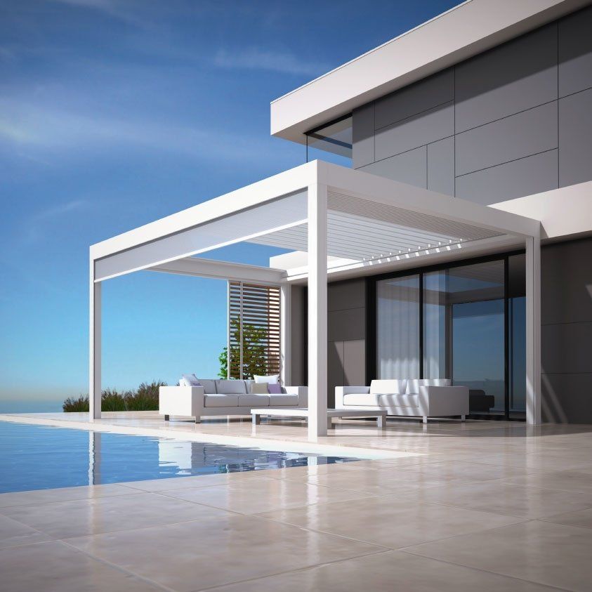 Algarve er en overbygging og pergola som du kan plassere over alt: på terassen din, ved siden av svømmebassenget, frittstående i hagen eller på brygga. Den kan også brukes som designcarport. Algarven utstyres med fast tak til feks carport eller eller med lamelltak som kan rotere. Denne kan leveres med ekstrautstyr som, ledlys, varme, lyd, screens og skyvedører med glass eller loggia.